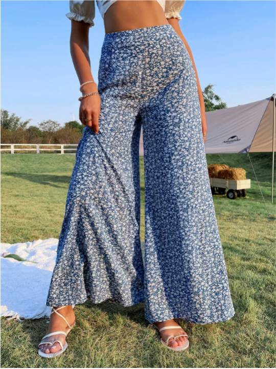 بنطلون واسع الساق بطبعة زهور بخصر مرتفع بأحجام وألوان مختلفة.